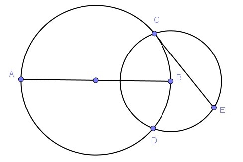 Две окружности пересекаются в точках C и D. Точка B — центр второй окружности, а отрезок AB — диаметр первой. Из точки C провели касательную к первой окружности, которая пересекает вторую окружность в точке E, отличной от C. Найдите радиус первой окружности, если радиус второй равен 15, а длина отрезка CE равна 18.