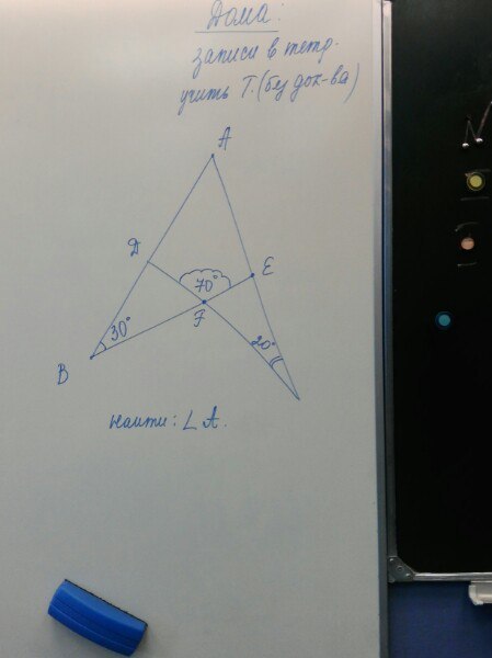 по свойству смежных углов угол дфб=180-70 =110 рассмотрим треуг дфб по свойству треуг 180-110-30(по усл)=40(угол фдб) по свойству смежных опять же 180-40=140(угол фда) рассмотрим второй нижний треуг угол ф =180-70 =110 далее по свойству треуг 180-110-20=50(угол нижний) рассмотрим четырехугольник фдае(сумма углов 360) следовательно 360-140-70(по усл)-130=20(искомый угол а)