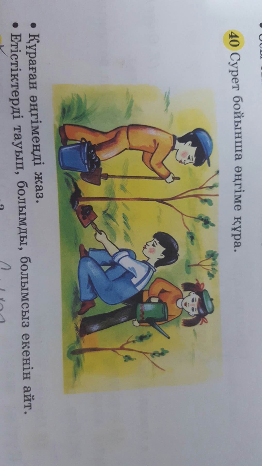 Қыс өтіп көктемде келіп жетті.Далада құстар ұшып гүлдер жайқалып өсіп жатыр Күн де жылынып келеді.Осы сəтті пайдаланып Мақсат пен Жандос жəне Алтынай үшеуі көшет отырғызуға кетті.Жандос пен Мақсат жерді қазып көшет отырғызып жатыр.Ал Алтынай қолына су құйғышын алып отырғызылған көшетке құяйын деп жатыр.Көшет бірнеше аптадан кейін жайқалып өсіп, жемісін берді.