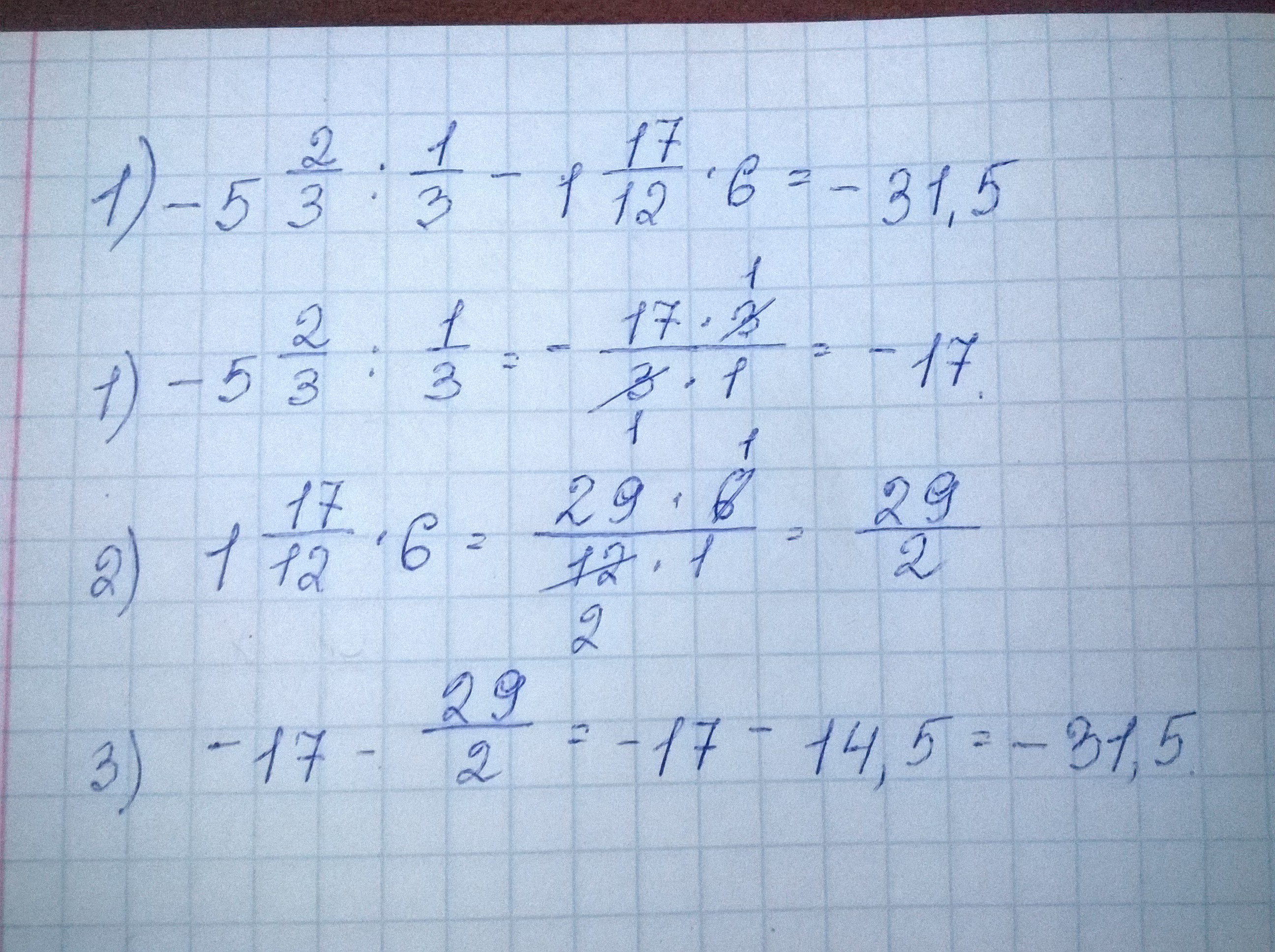 1.-5 2/3 : 1/3 - 1 17/12 * 6 =