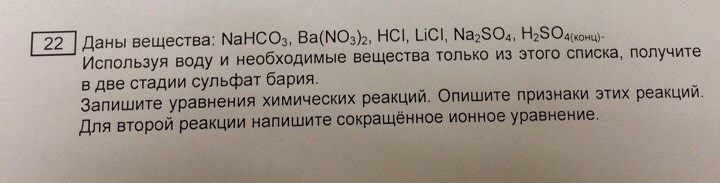 Используя воду и необходимые вещества из этого списка, получите в две стадии сульфат бария.