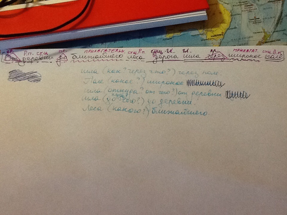 Распространённое, повествовательное, утвердительное, невосклицательное, простое, двусоставное, полное. сказуемое здесь ДОРОГА ШЛА ЧЕРЕЗ ПОЛЕ, так как "шла" не в прямом значении. [–=].