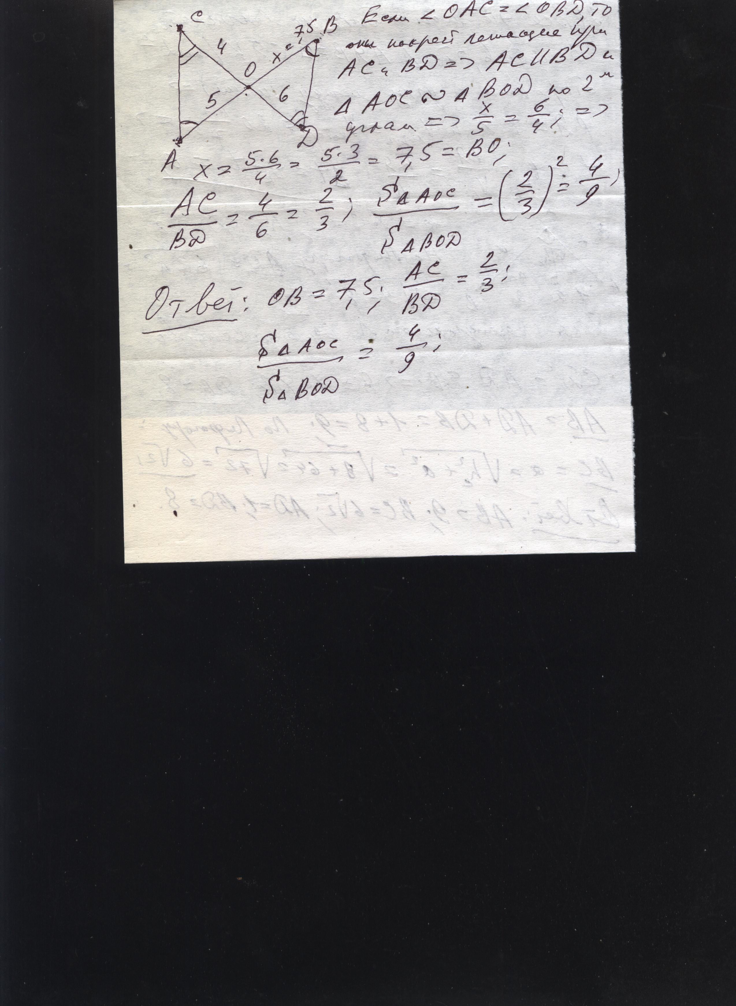 Отрезок АВ пересекается с отрезком СД в точке О, причем угол А= углу В, СО=4, DO=6, AO=5.