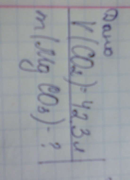 Vm= 22,4 г/дм кубический, по формуле m=Vумножить на Vm затем по формуле n=m/M где M=Mr найди химическое кол-во и подставь в формулу тем самым через х найдешь хим кол-во MgCO3 и по первой формуле его массу