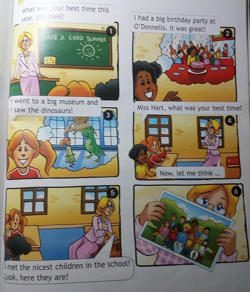 1. Какое для вас было лучшее время в этом году, дети? 2. У меня была большая праздничная вечеринка О`Доннелс. Было прекрасно! 3. Я ходила в большой музей и видела динозавров! 4. Мисс Харт, что для вас было лучшим временем? Теперь позвольте мне подумать... 5. Я встретила красивых детей в школе. Посмотрите, они здесь!