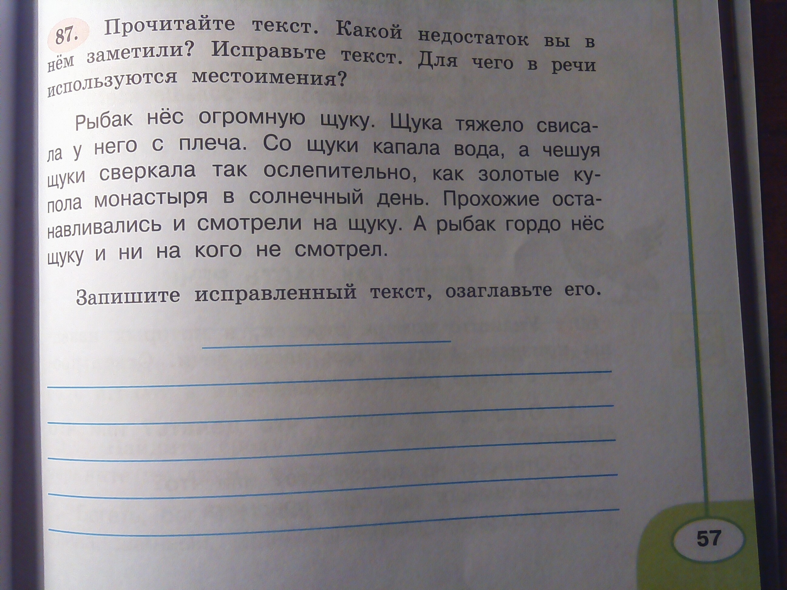 Рыбак нёс огромную щуку. Она тяжело свисала у него с плеча. С щуки капала вода, а чешуя ее сверкала так ослепительно, как золотые купола монастыря в солнечный день. Прохожие останавливались и смотрели на щуку. А рыбак гордо нес ее и ни на кого не смотрел.