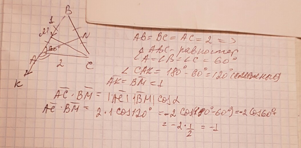 Вычислите скалярное произведение вектора АС на вектор ВМ.