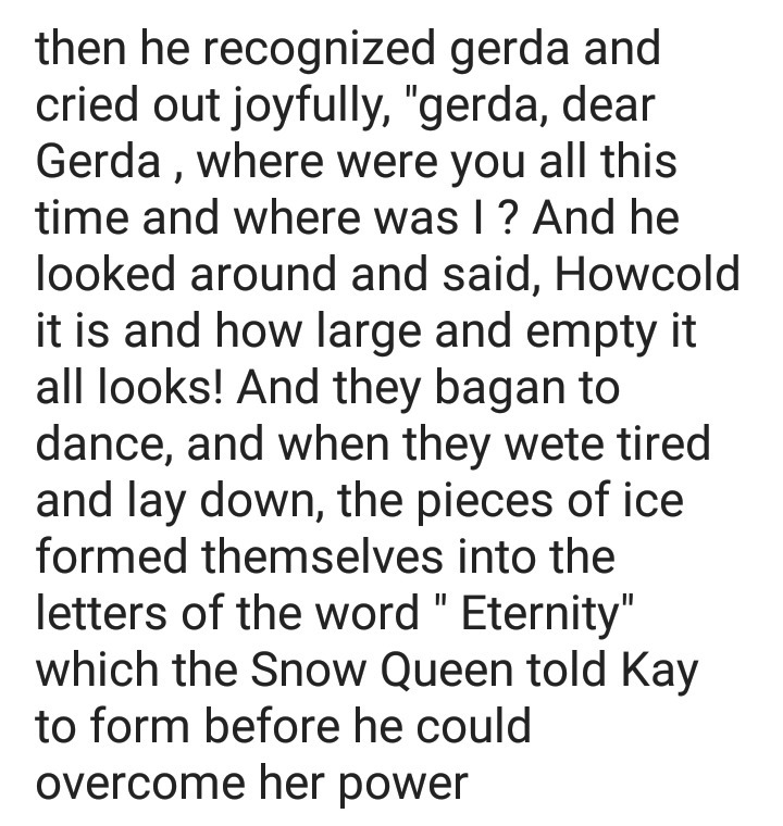 И тогда он узнал Герду и с радостью вскричал/воскликнул: «Герда, дорогая Герда, где ты была все это время, а где был я?» И он огляделся и сказал: "здесь холодно, и он (видимо замок у королевы, если по сказке) огромный и пустой!» И они стали танцевать , И когда они устали и легли, кусочки льда образовывали/нарисовали буквы «Вечность», которые Снежная королева велела Каю выложить до того, как он смог Одержать над ней победу