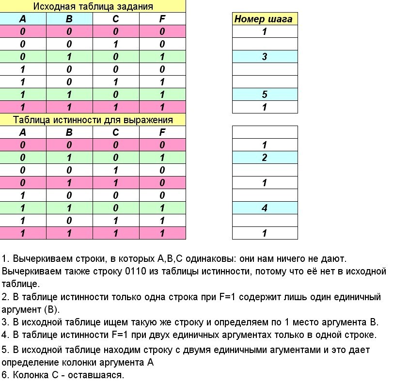 Уточнение к шагу 4. Только одна комбинация из двух единичных аргументов, один из которых В, колонка которого уже известна.