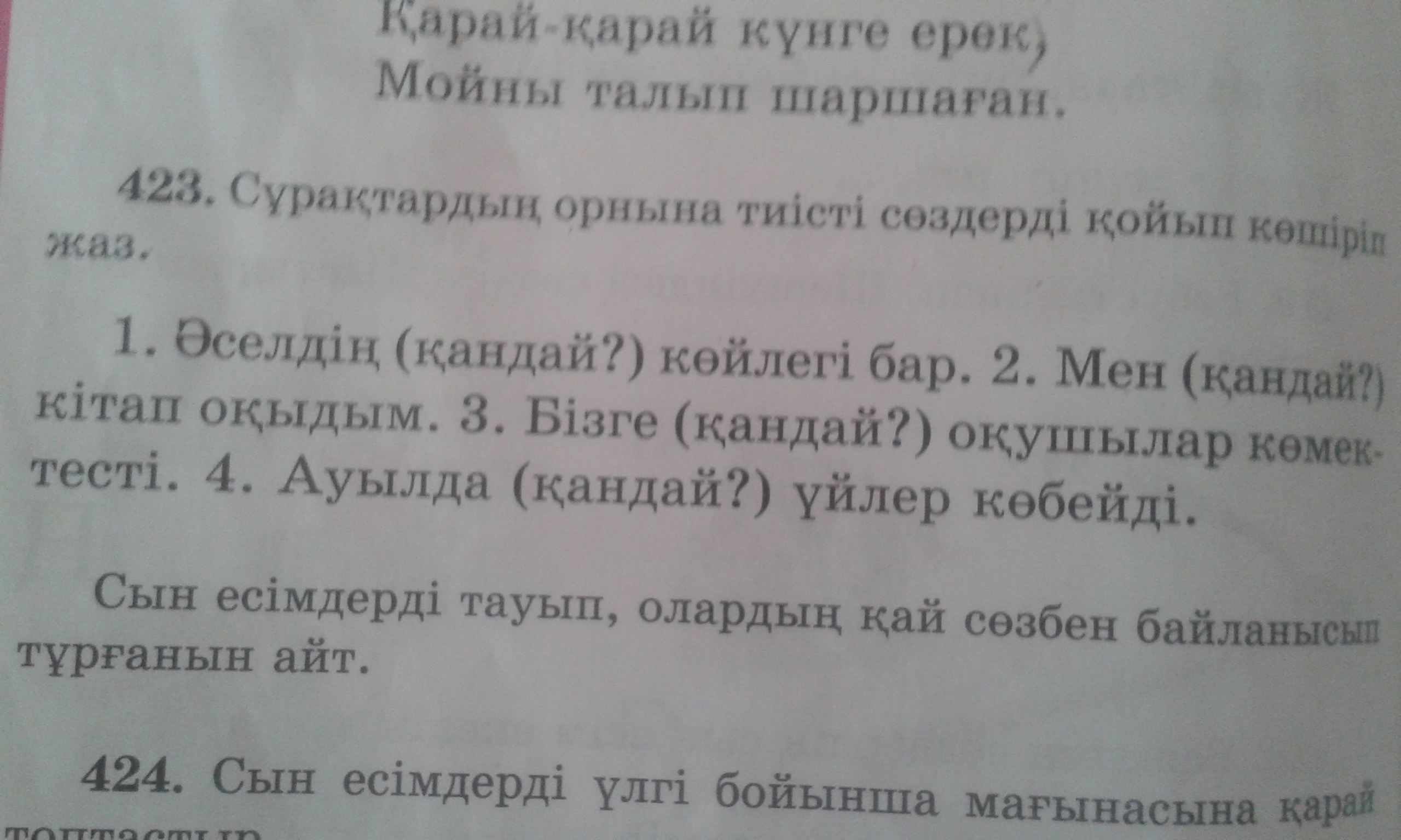 Әселдің қызыл көйлегі бар. Мен әдеби кітап оқыдым. Бізге озат оқушылар көмектесті. Ауылда жаңа үйлер көбейді
