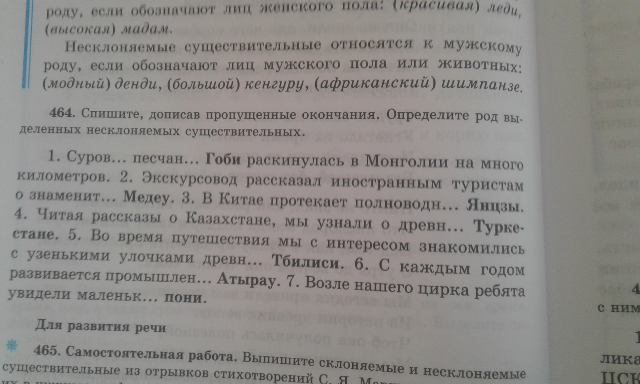 1. Суровая песчаная Гоби (ж.р., пустыня). 2. О знаменитом Медеу (м.р., комплекс). 3. Полноводная Янцзы (ж.р., река). 4. О древнем Туркестане (м.р.). 5. Древнего Тбилиси (м.р., город). 6. Развивается (что?) промышленность Атарау (м.р., город). 7. Маленького пони (м.р.).