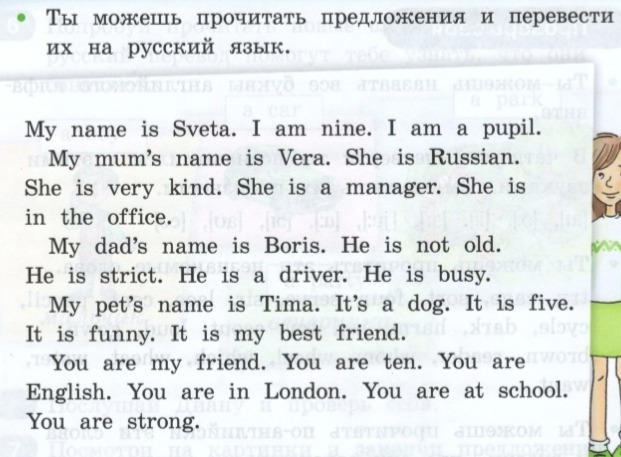 Моего папу зовут Борис. Он не очень старые. Он строгий. Он водитель. Он занятой. Мое домашнее животное зовут Тима. Это собака. Сейчас ему пять лет. Это весело/смелно. Это мой лучший друг. Ты мой друг. Тебе десять лет. Ты анличанин. Вы в Лондоне. Ты в школе. Ты сильный.