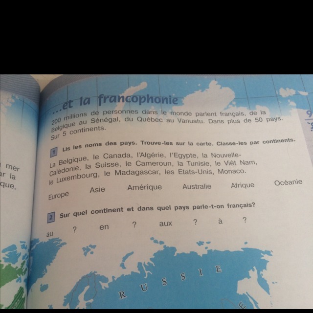 3)On parle français: en Belgique, au Canada, à l'Algérie, à l'Egypte, en Nouvelle-Calédonie, en Suisse, au Cameroun, en Tunisie, au Viêt Nam, au Luxembourg, au Madagascar, aux Etat-Unis, à Monaco.
