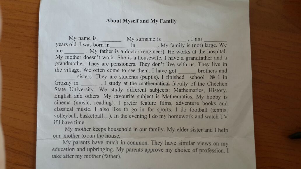Меня зовут Я Моя фамилия лет. Я родился в моей семье (не большой). Мы, мой отец, врач (инженер). Он работает в больнице. Моя мать не работает. Она - домохозяйка. У меня есть дедушка и бабушка. Они пенсионеры. Они не живут с нами. Они живут в деревне. Мы часто приходим к ним. У меня есть братья и сестры. Это ученики (ученики). Я окончил школу № 1 в Грозном, я учился на математическом факультете Чеченского государственного университета. Мы изучаем разные предметы: математику, историю. Английский и другие. Мой любимый предмет - математика. Мое хобби - это кино (музыка, чтение). Я предпочитаю художественные фильмы, приключенческие книги и классическую музыку. Я также люблю заниматься спортом. Я занимаюсь футболом (теннис, волейбол, баскетбол) Вечером я делаю домашнее задание и смотрю телевизор, если есть время Моя мать ведет домашнее хозяйство в нашей семье. Моя старшая сестра и я помогаем нашей маме управлять домом. У моих родителей много общего У меня сходные взгляды на мое воспитание и воспитание, родители одобряют мой выбор профессии, берутся за мать (отца) ЗАКРЫТЬ
