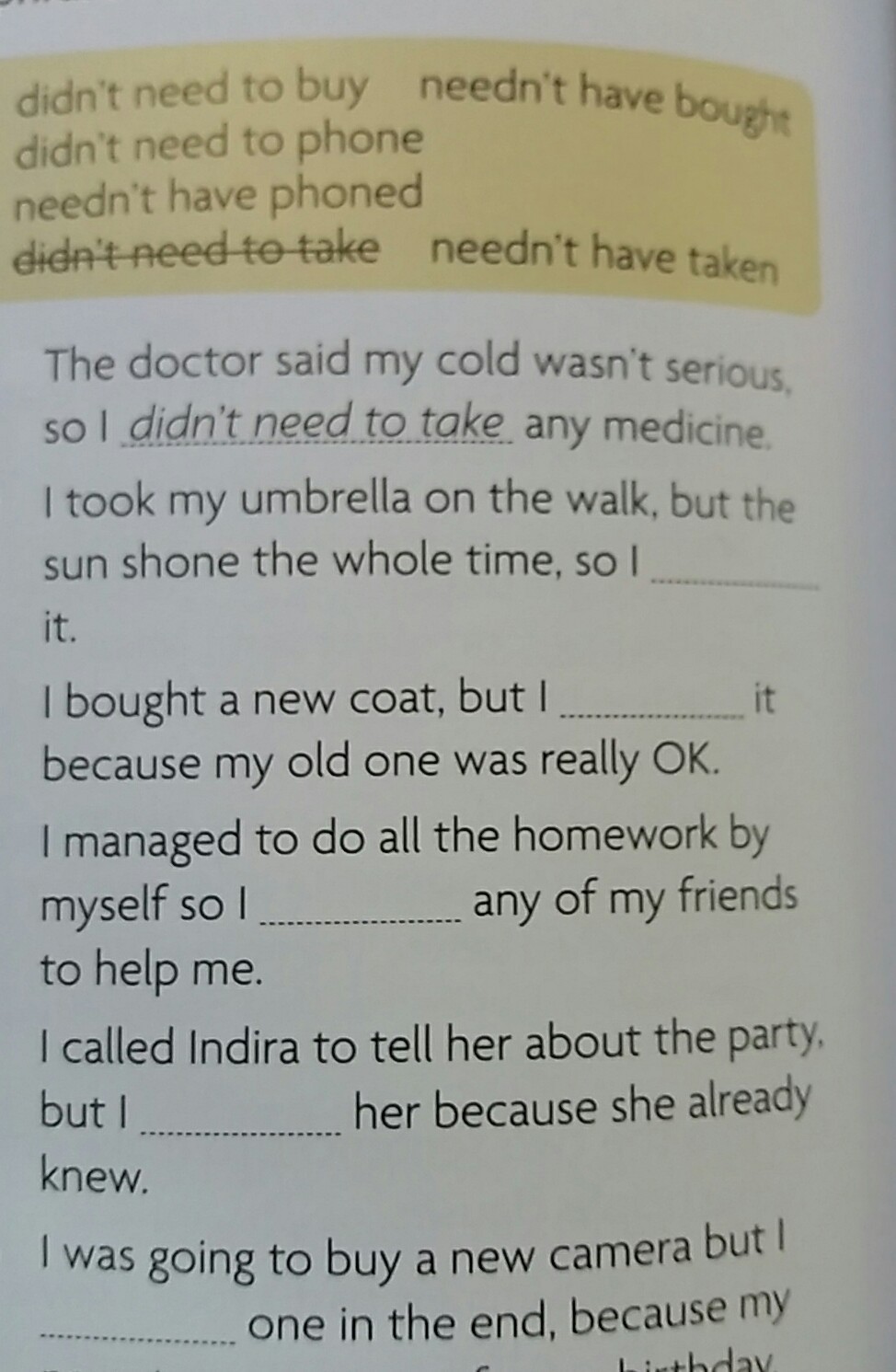 Needn't have taken, didn't need to buy, didn't need to phone, needn't have phoned, needn't have phoned