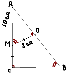 Тр. ВОМ подобен тр АВС (угол ВОМ = 90 град.( МО - расстояние), угол В - общий , Угол ВМО = углу ВСА (это выходит из равенства предыдущих углов))