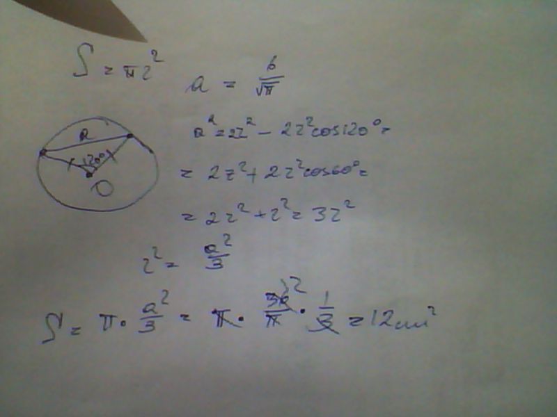 найти площадь круга,если хорда,длинна которой 6 деленное на число пи в корне,видна из центра окружности под углом 120 градусов