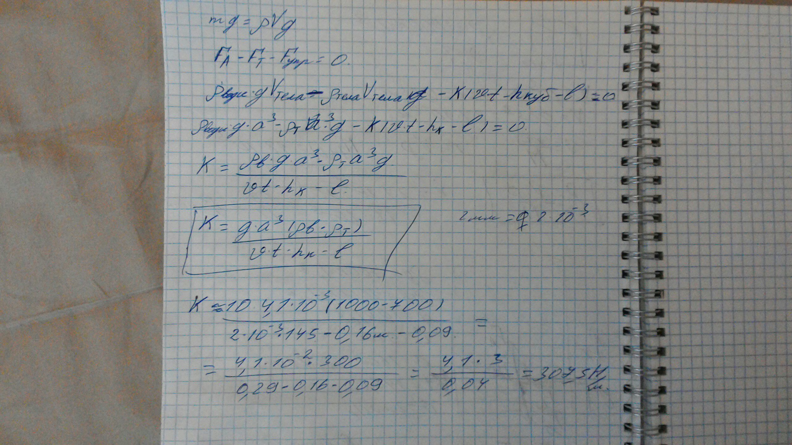 На дне пустой бочки лежит деревянный брусок, имеющий форму кубика со стороной а=16 см. Середина нижнего основания кубика соединена легкой тонкой упругой резинкой с дном бочки. Длина резинки l=9 см. Бочку заполняют водой так, что ее уровень в бочке увеличивается со скоростью 2мм/с. Плотность дерева ρ=700 кг/м3, плотность воды 1000кг/м3.