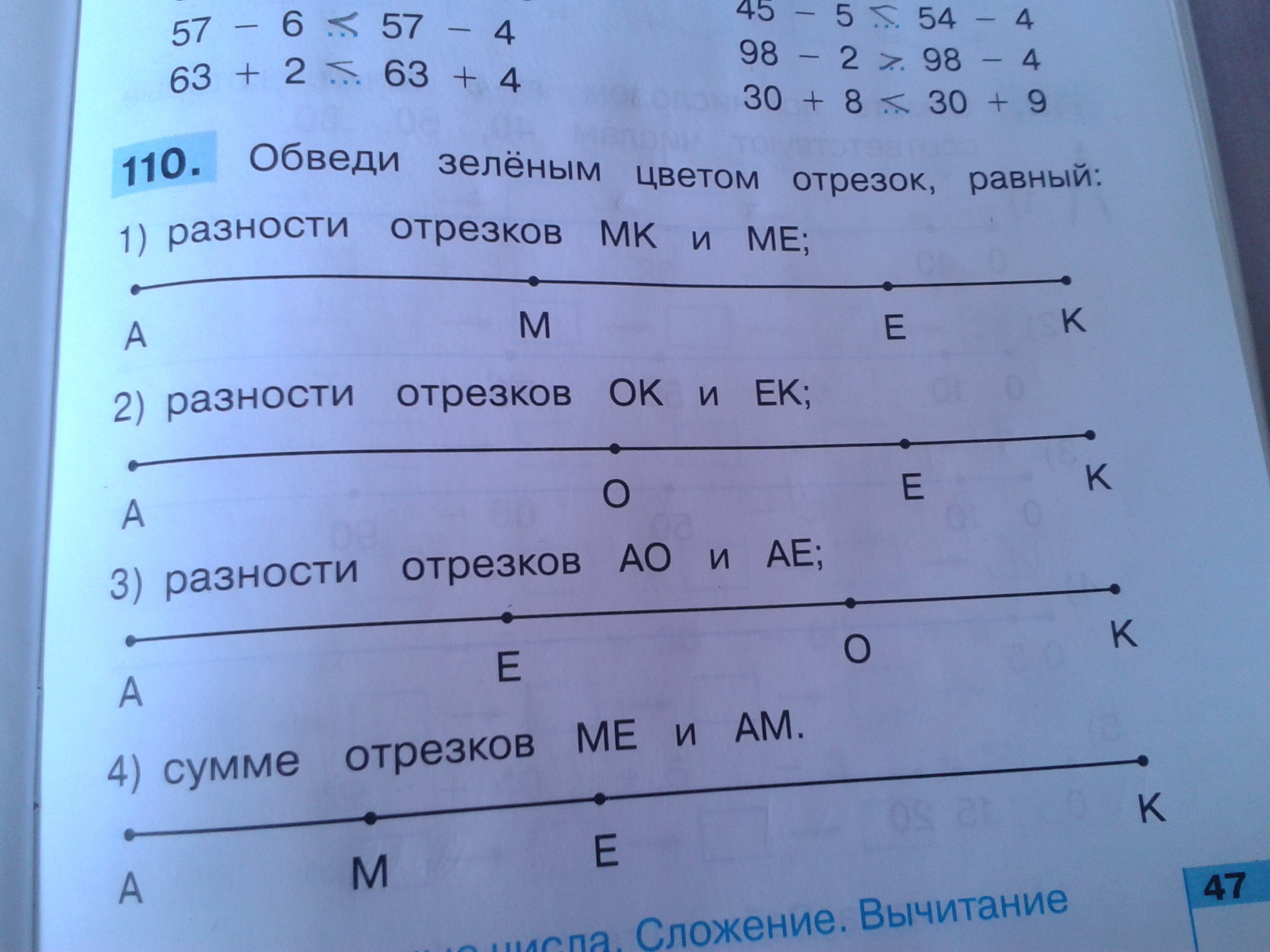 Обведи зелёным цветом отрезок,равный: 1) разности отрезков МК и МЕ; 2) разности отрезков ОК и ЕК; 3) разности отрезков АО и АЕ; 4) сумме отрезков МЕ и АМ.
