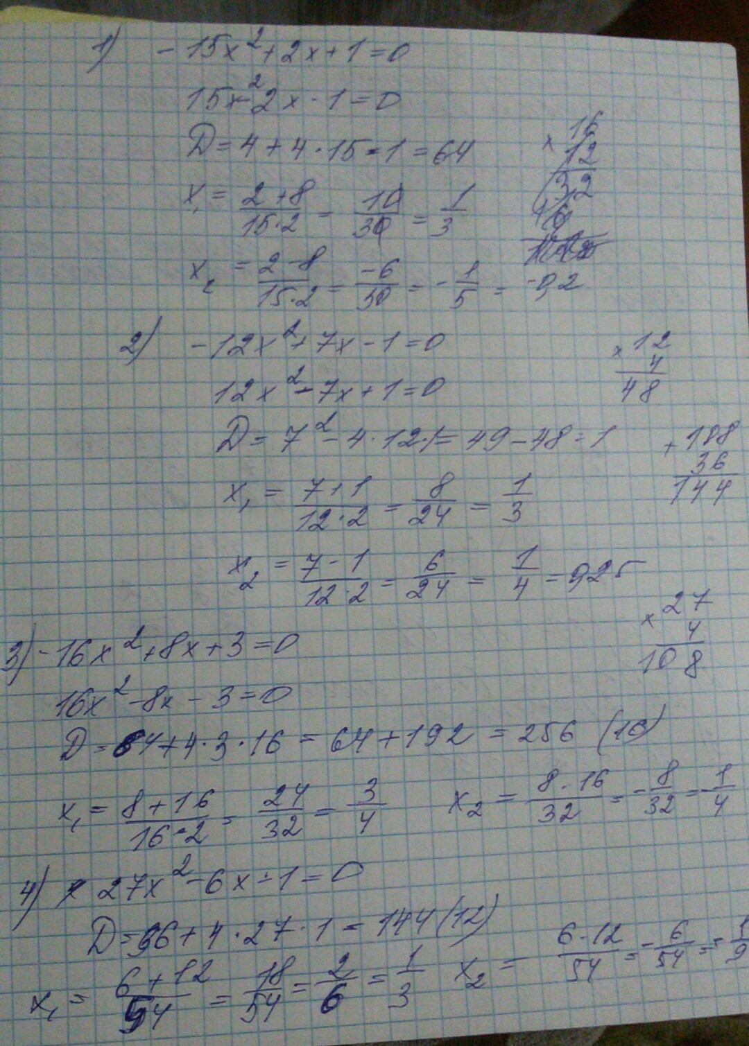 Алгебра 8 класс. Помогите сделать ДЗ пожалуйста 1) -15x^2+2x+1 2)-12x^2+7x-1 3)-16x^2+8x+3 4)27x^2-6x-1