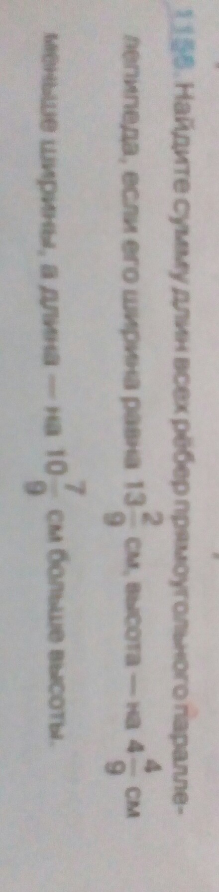 Найдите сумму длин всех ребер прямоугольного параллелепипеда если его ширина равна 13 Целых 2/9 см высота на 4 целых 4/9 см меньше ширин, а длина на 10 целых 7/9 см больше высоты