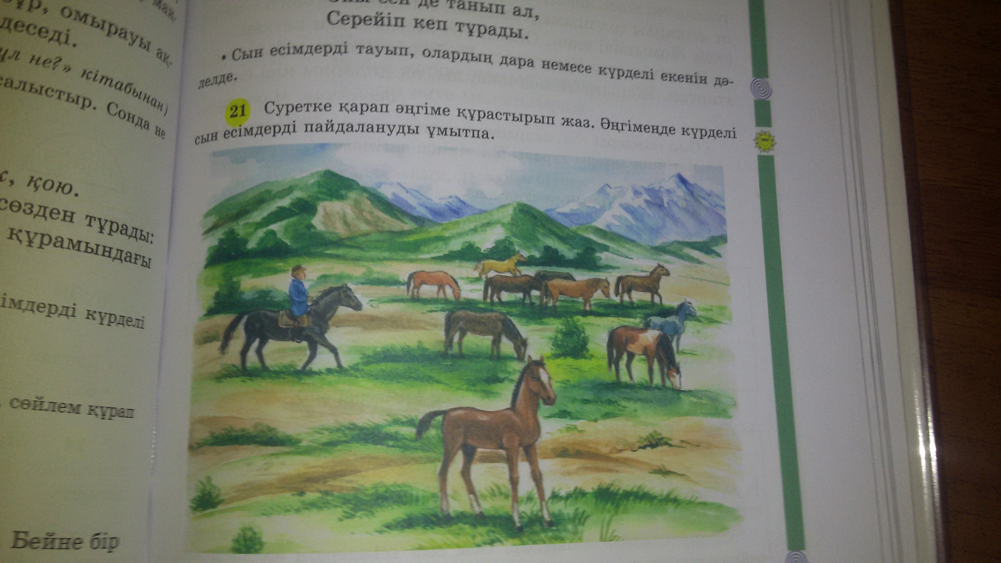 Мен әкеммен жайлауға аттарды апардық.Жайлауда таза ауа,жасыл жер,бұлақ ағып жатыр.Онда жылқылар бар:торы ала,көк ала,қоңыр ала.Жайлауда керемет болды.
