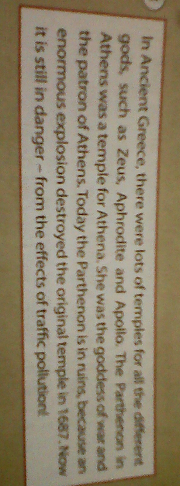 В Древней Греции было множество храмов различных богов, таких как Зевс, Афродита и Аполлон. Парфенон в Афинах был храм Афины. Она была богиней и покровительницей Афин. Сегодня Парфенон находится в руинах, потому что огромный взрыв уничтожил первоначальный храм в 1687 году. Сейчас он все еще находится в опасности, от воздействия транспортных загрязнений.