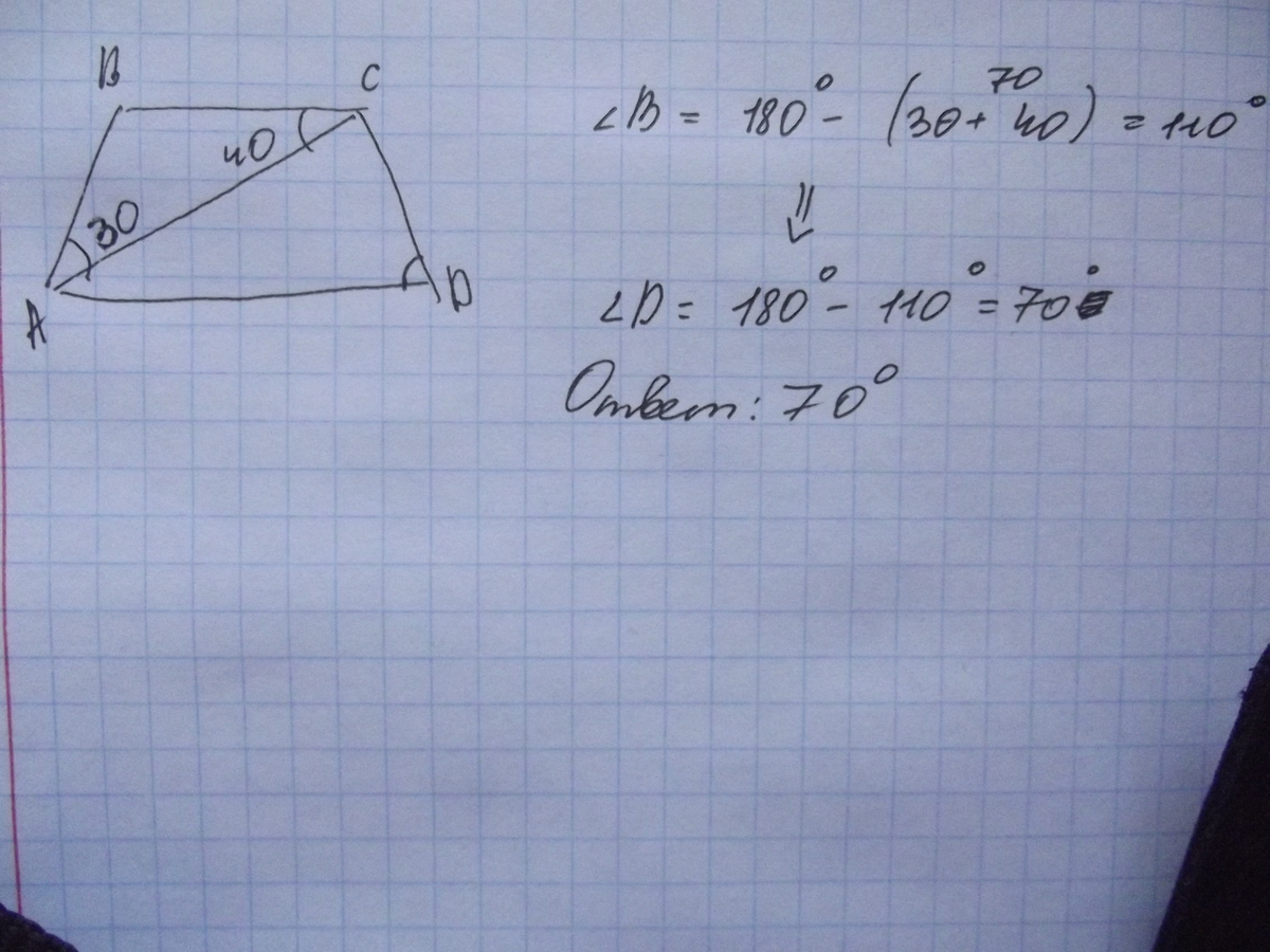 Найдите угол АДС равнобедренной трапеции АВСД если диагональ АС образует с основанием ВС и боковой стороной АВ углы равные 30 и 40 градусов соответственно.