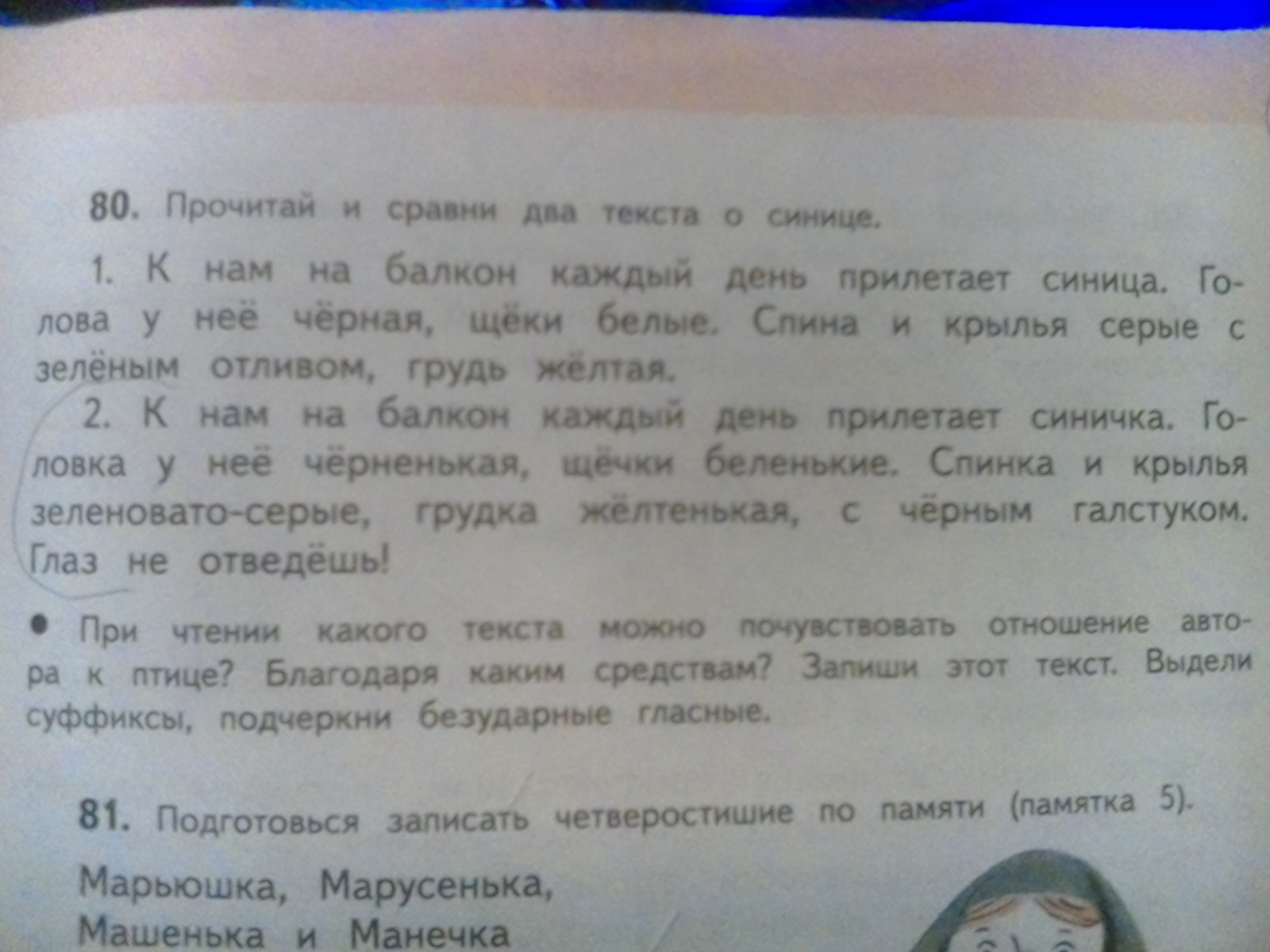 2 текст. Автор высказывает свое отношеение с помощью уменьшительно-ласкательных суффиксов -к,-еньк