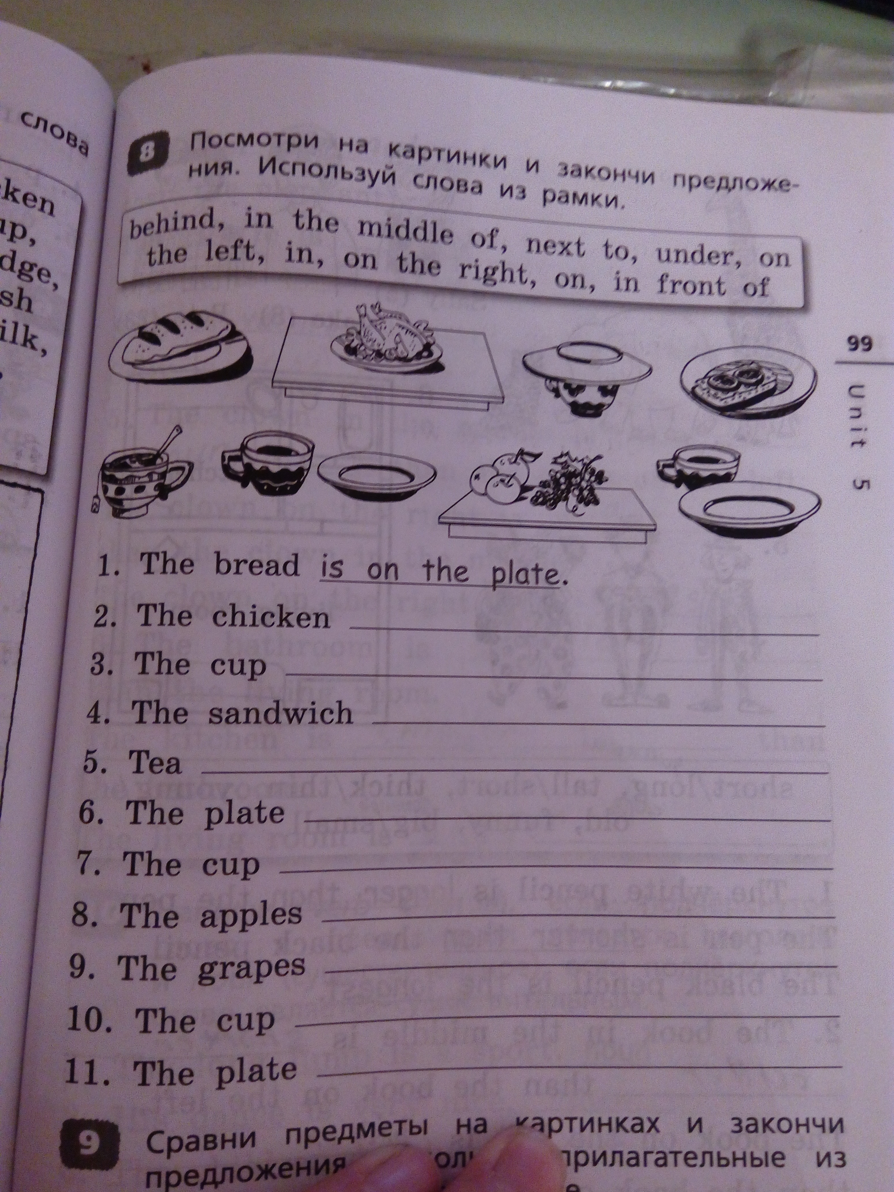 Посмотри на картинку и закончи предложения используя слова :behind,in the middle of,next to ,under,on the left,in ,on the right,on,in front of