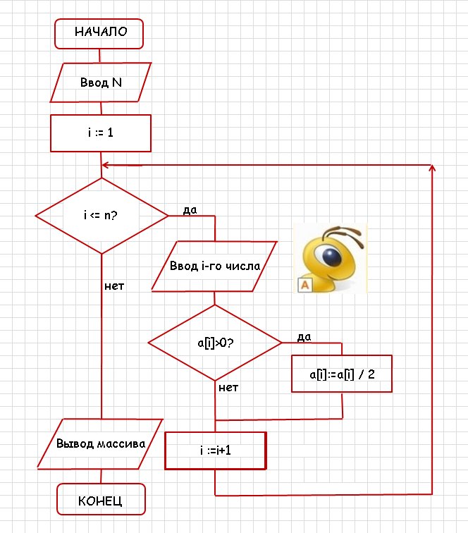 Даны натуральное число n и последовательность целых чисел а1, а2,…,аn..Все положительные элементы уменьшить в 2 раза. Составить блок-схему алгоритма, написать программу