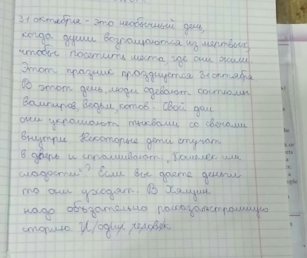 October 31 is a special day, when the soul is revived from the dead to visit the places where they lived. this holiday is celebrated on October 31. on this day, people wear costumes of vampires, witches, cats. your house they are decorated with pumpkins with candles inside. some children knock on the door and ask" trick-or-treating? " if you give money, then they leave. in Halloween it is necessary to tell a scary story