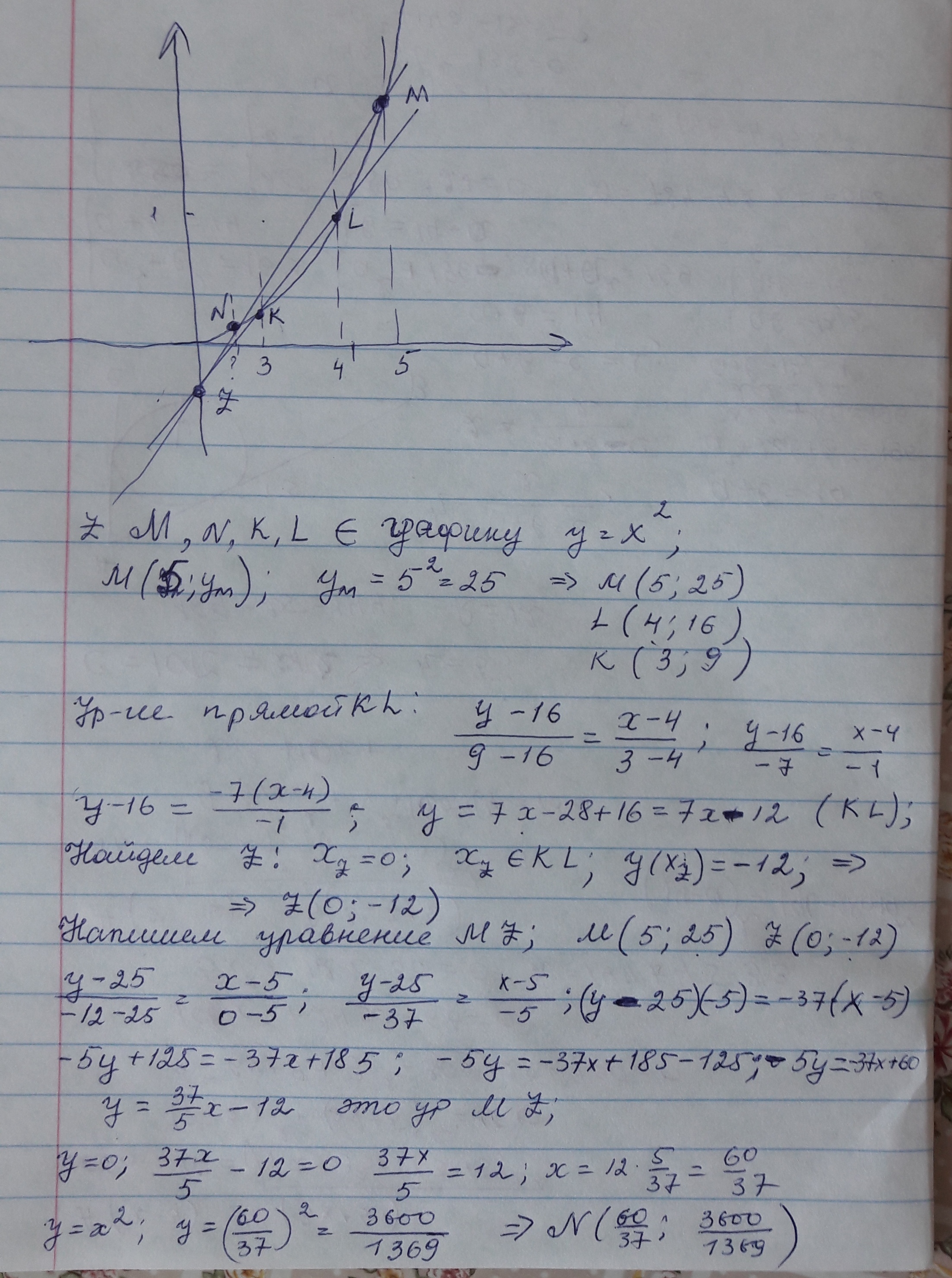 Мистер Фокс нарисовал параболу y=x^2 и отметил на ней четыре точки K, L, M и N. Оказалось, что точки выбраны им так, что прямые KL и MN пересеклись на оси ординат. Чему равна абсцисса точки N, если абсциссы точек K, L и M соответственно равны 4, 3 и 5?