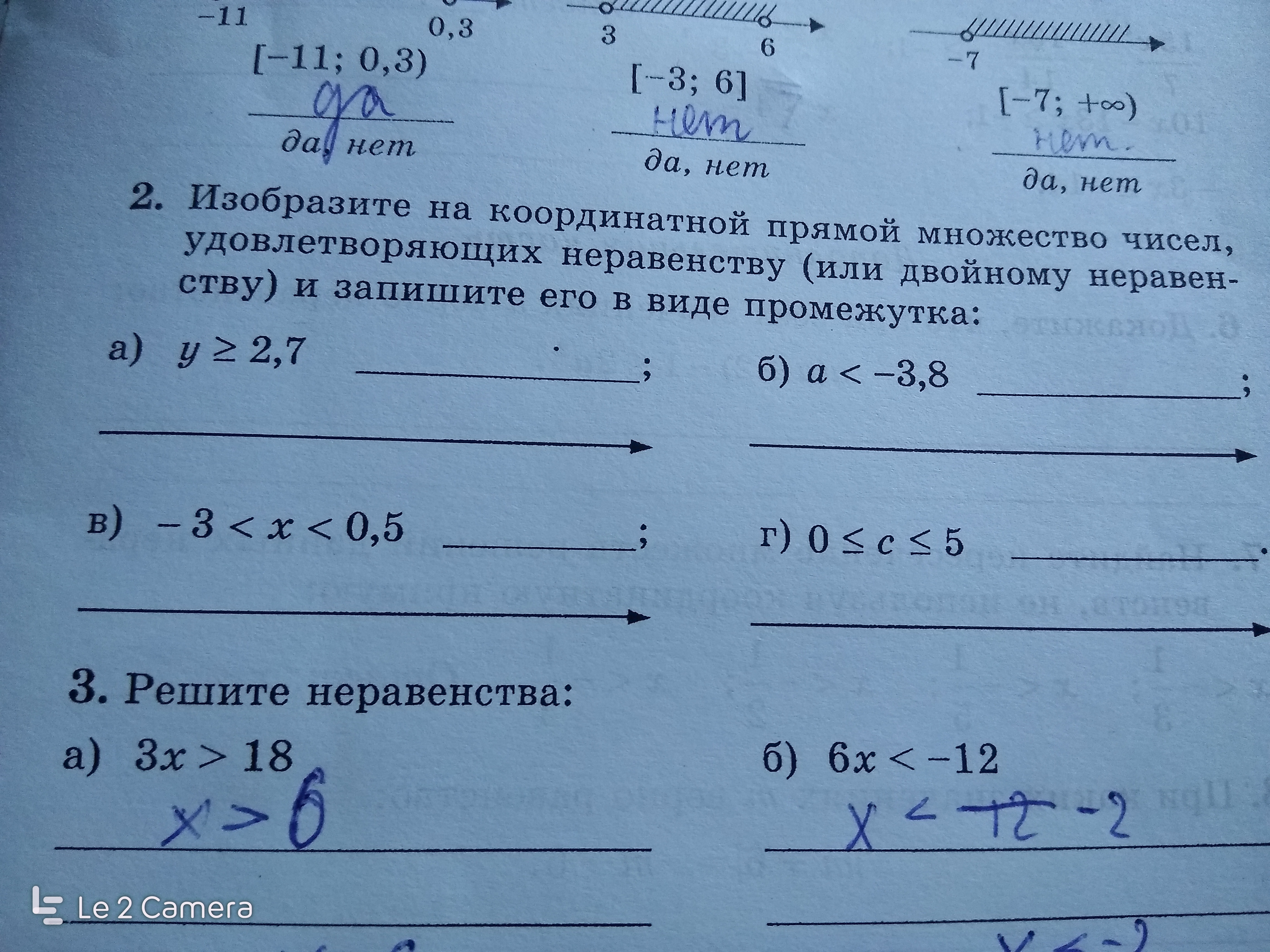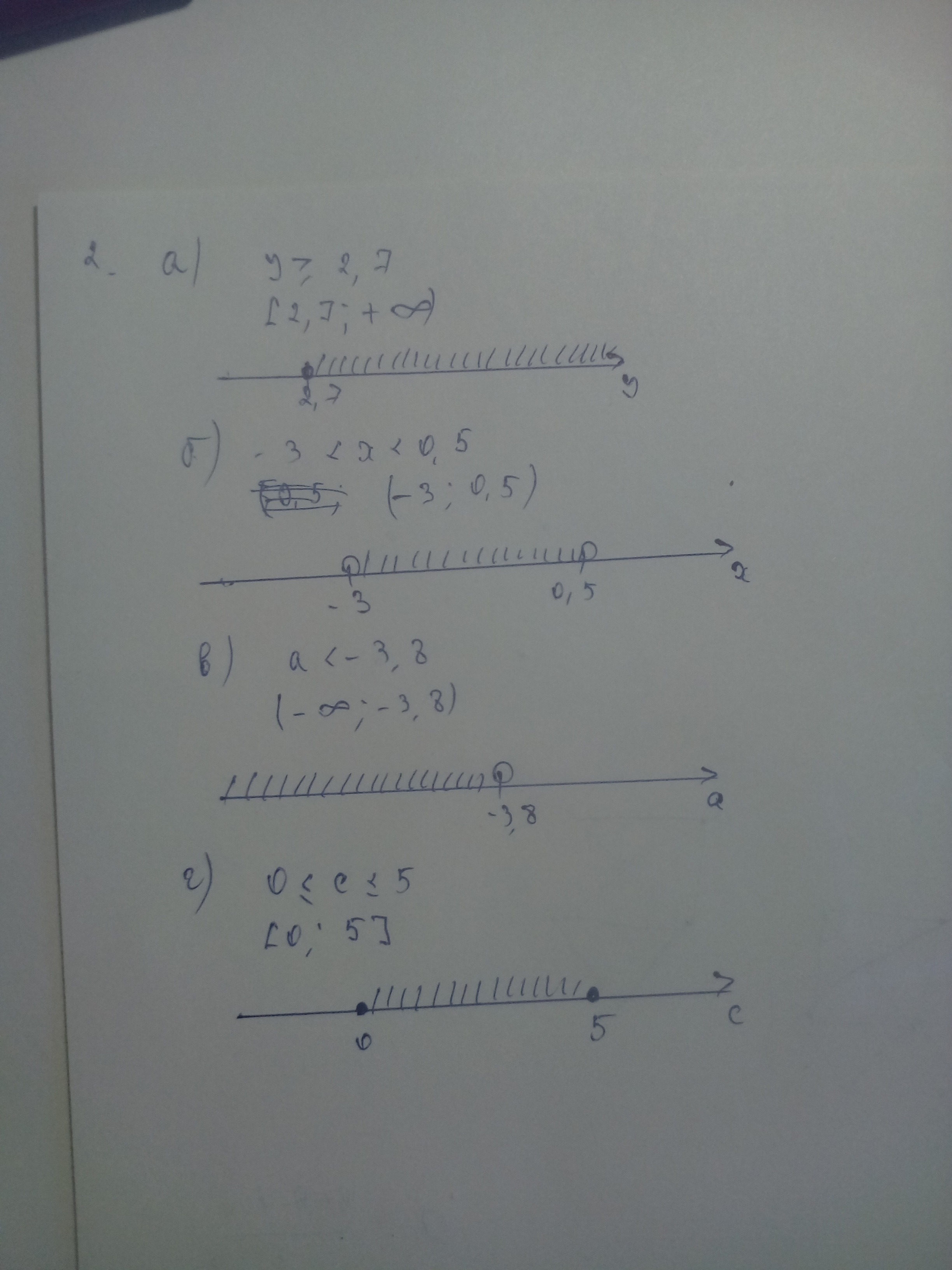 a) y ∈ [2.7, ∞). На координатной прямой нарисуйте тёмную точку «2.7» и штрихи от неё в правую сторону вплоть до стрелки.