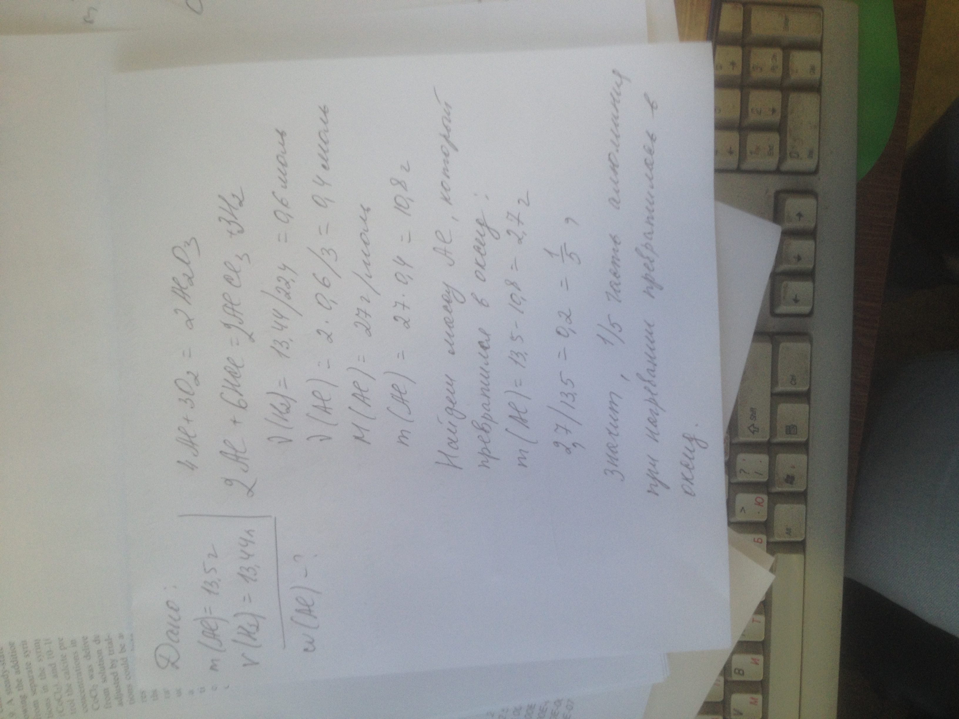 10.Алюминиевый порошок массой 13,5 г нагрели на воздухе, а затем получившуюся массу растворили в соляной кислоте. Выделилось 13,44 л газа (н.у.). Определите, какая часть алюминия при нагревании превратилась в оксид. Тоже с "Дано"