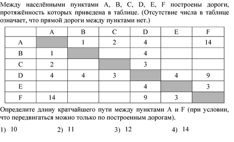 1) Между населенными пунктами А В С D E F построены дороги, протяженность которых приведена в таблице. (Отсутствие числа в таблице означает, что прямой дороги между пунктами нет) Определите длину кратчайшего пути между пунктами А и F (при условии что передвигаться можно только по построенным дорогам)