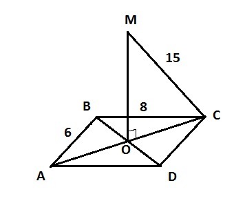 через точку O пересечения диагоналей прямоугольника ABCD проведены перпендикуляр MO. найдите длину MO если AB = 6 см; BC = 8 см; MC = 15 см