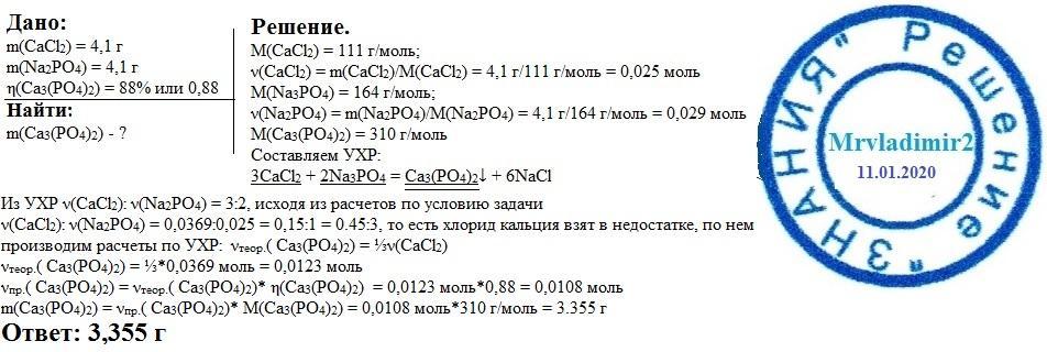 к раствору, содержащему хлорид кальция массой 4,1 г, прилили раствор,содержащий фосфат натрия массой 4,1 г. Определите массу полученного осадка,если выход продукта составляет 88%.