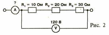 Определить по данной схеме общее сопротивление цепи и показание амперметра (рис. 2).