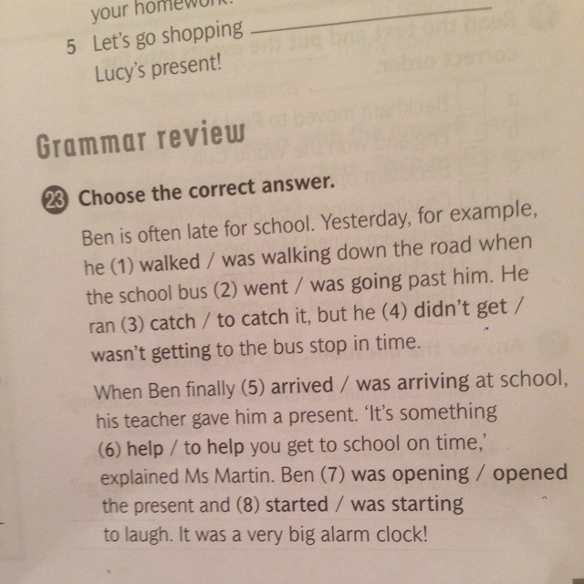 1 was walking 2 was going 3 to catch 4 didn't get 5 arrived 6 to help 7 opened 8 started