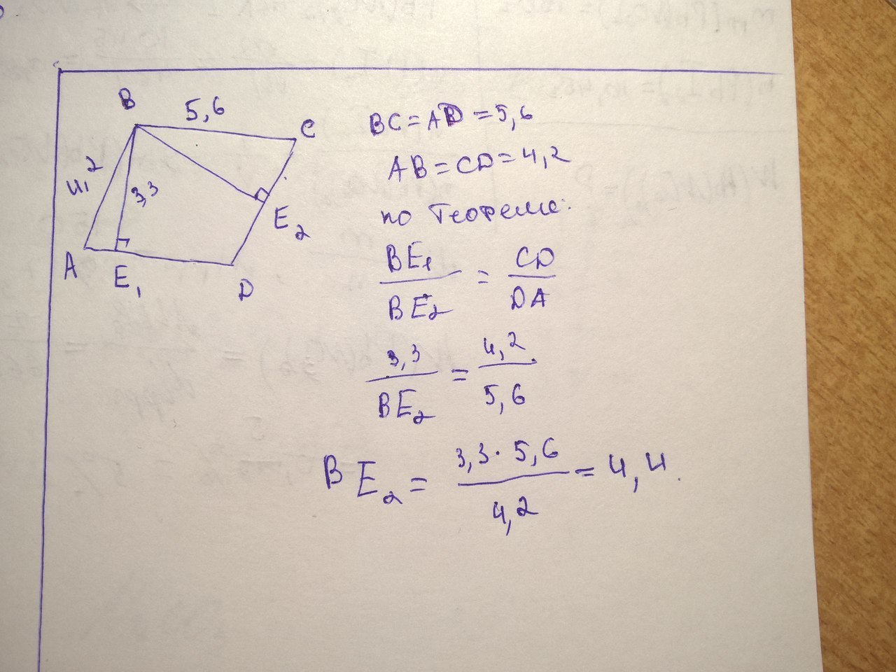 сторона параллелограмма равны 4,2 и 5,6 высота проведенная к большей стороне равна 3,3. вычислительной вторую высоту этого паралелограмма