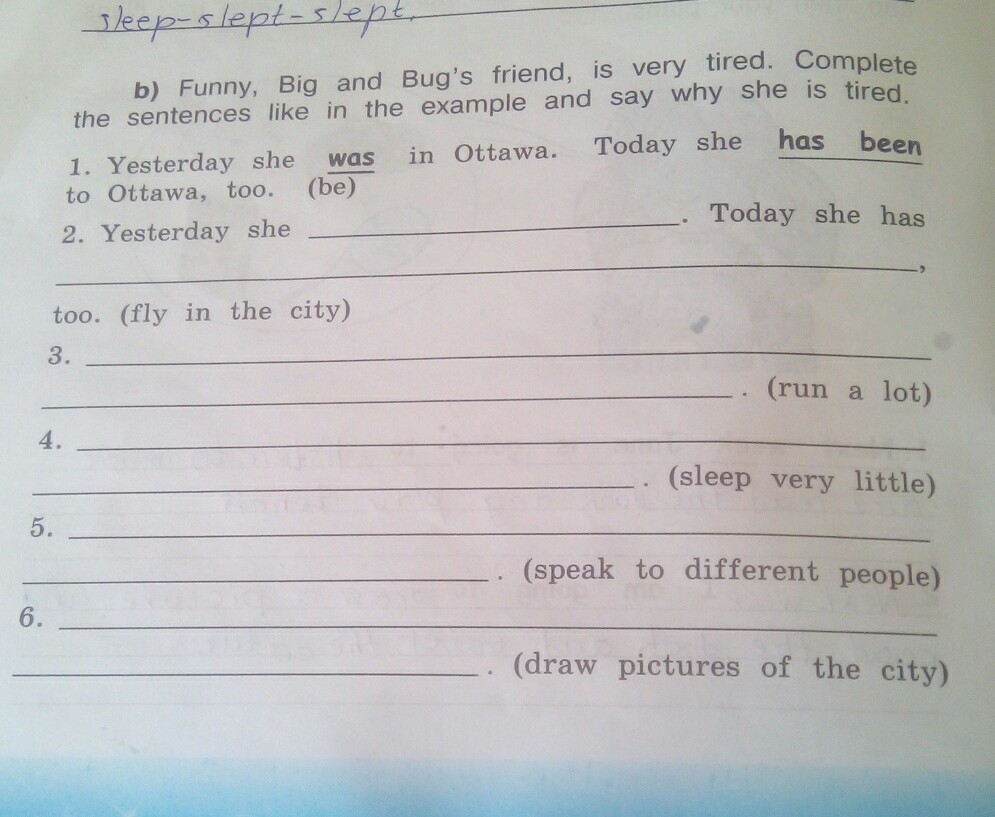 4. Yesterday she slept very little. Today she has slept very little, too. (sleep very little)