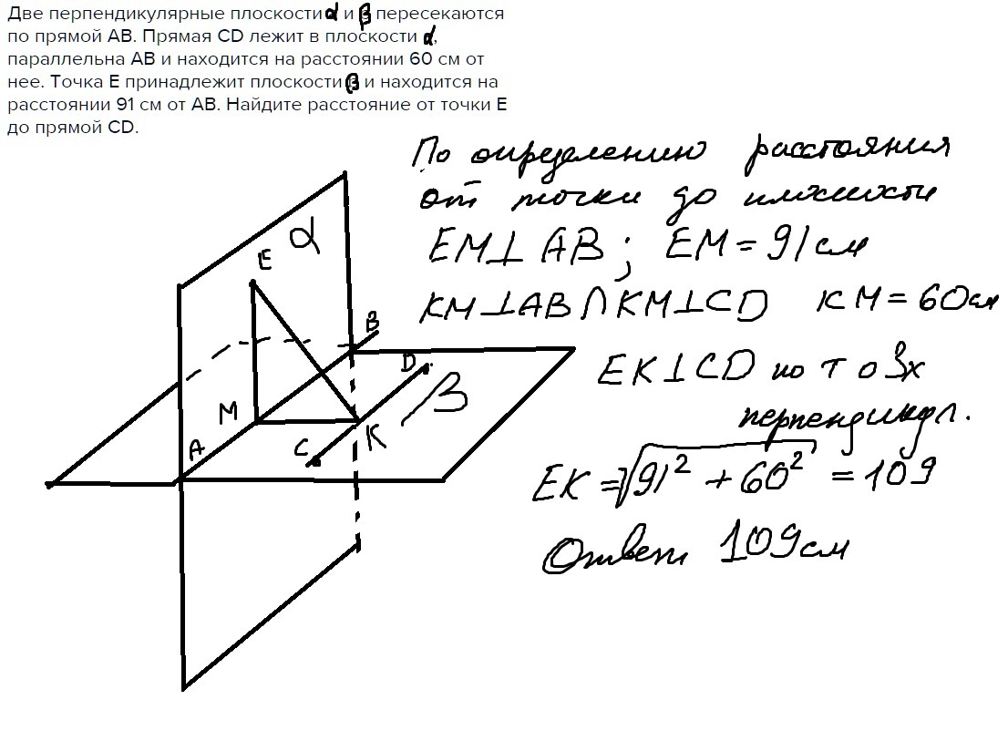 Две перпендикулярные плоскости a и b пересекаются по прямой AB. Прямая CD лежит в плоскости a, параллельна AB и находится на расстоянии 60 см от нее. Точка E принадлежит плоскости b и находится на расстоянии 91 см от AB. Найдите расстояние от точки E до прямой CD.