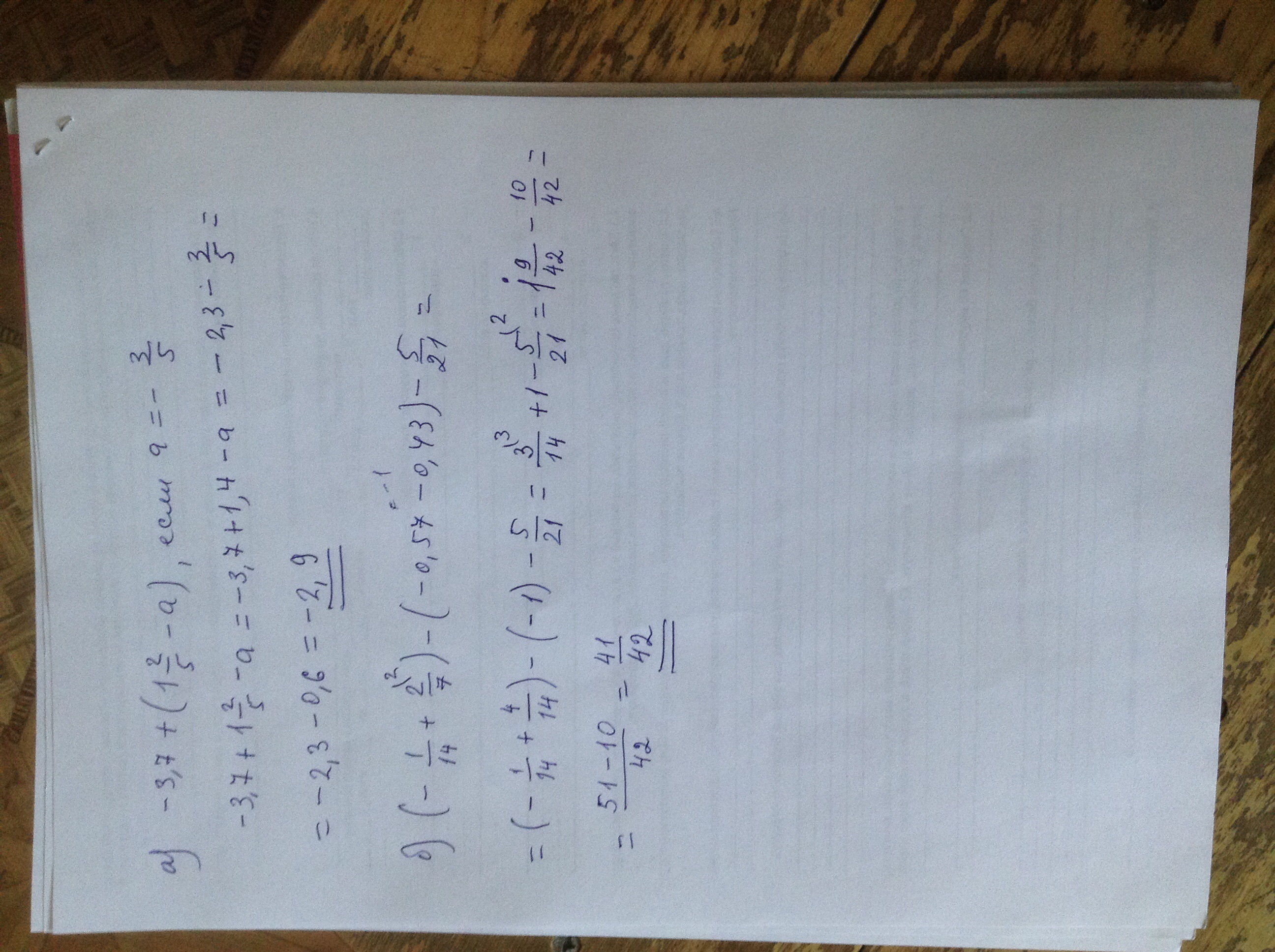 б) = (- 1/14 +4/14) - (- 0,57 - 0,43) - 5/21 = 3/14 - (- 1) - 5/21 = 3/14 + 1 - 5/21 = 1 3/14 - 5/21 = 1 9/42 - 10/42 = 41/42