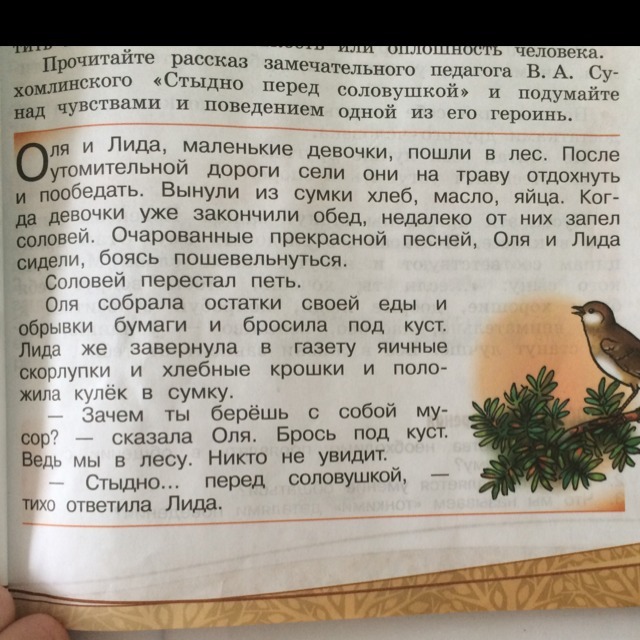 Прочитай рассказ В. А. Сухомлинского "Стыдно перед соловушкой" (он на фото) и объясни его название. Запиши свой ответ.