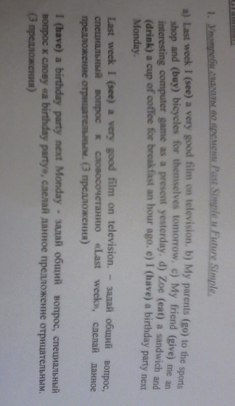 A saw b will go, will buy c gave d ate, drank e will have. Last week i saw a very good film on television. Did I see a very good film on television last week? When did I see a very good film on television? Last week I didn't see a very good film on television. I will have a birthday party next Monday. Will I have a birthday party next Monday? What will I have next Monday? I won't have a birthday party next Monday.