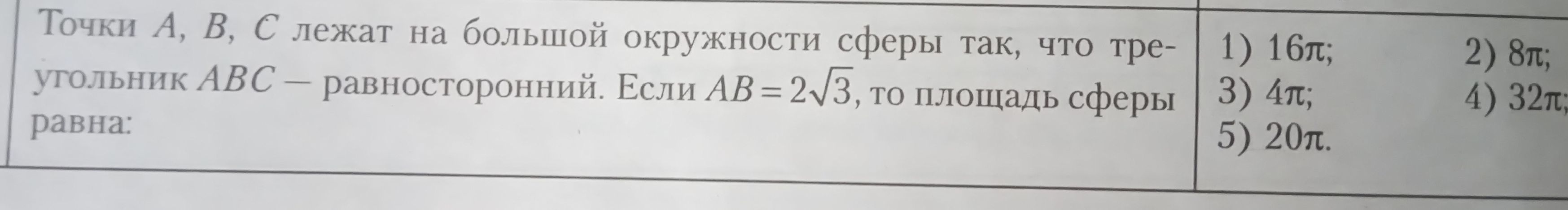 Точки A, B, C лежат на большой окружности сферы так, что треугольник ABC - равносторонний. Если AB=2√3, то площадь сферы равна: