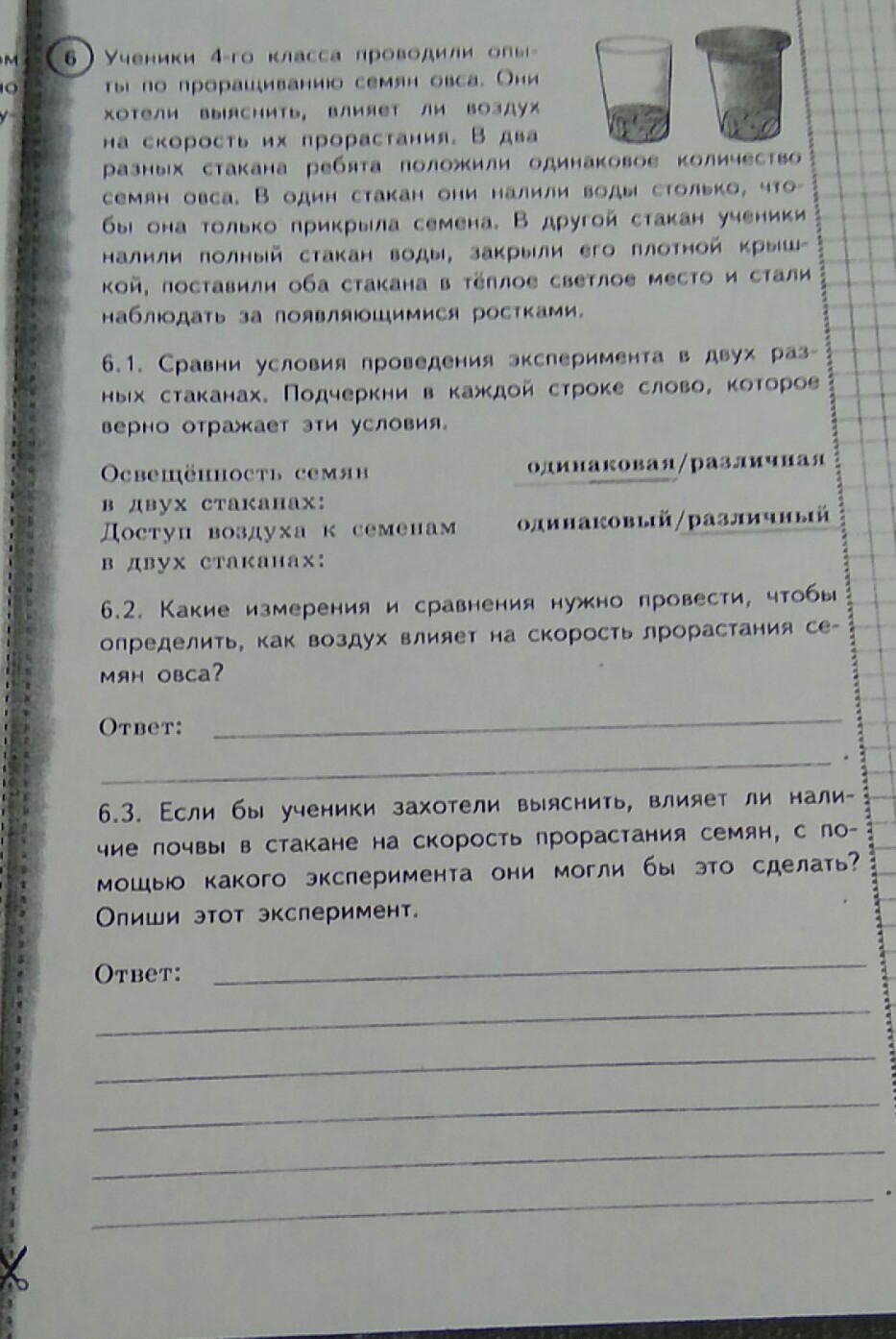 6.3 Им необходимо было бы в один стакан с семенами налить немного воды, а в второй стакан с семенами кроме воды добавить также немного почвы. После этого поставить стаканы в теплое место и ждать.