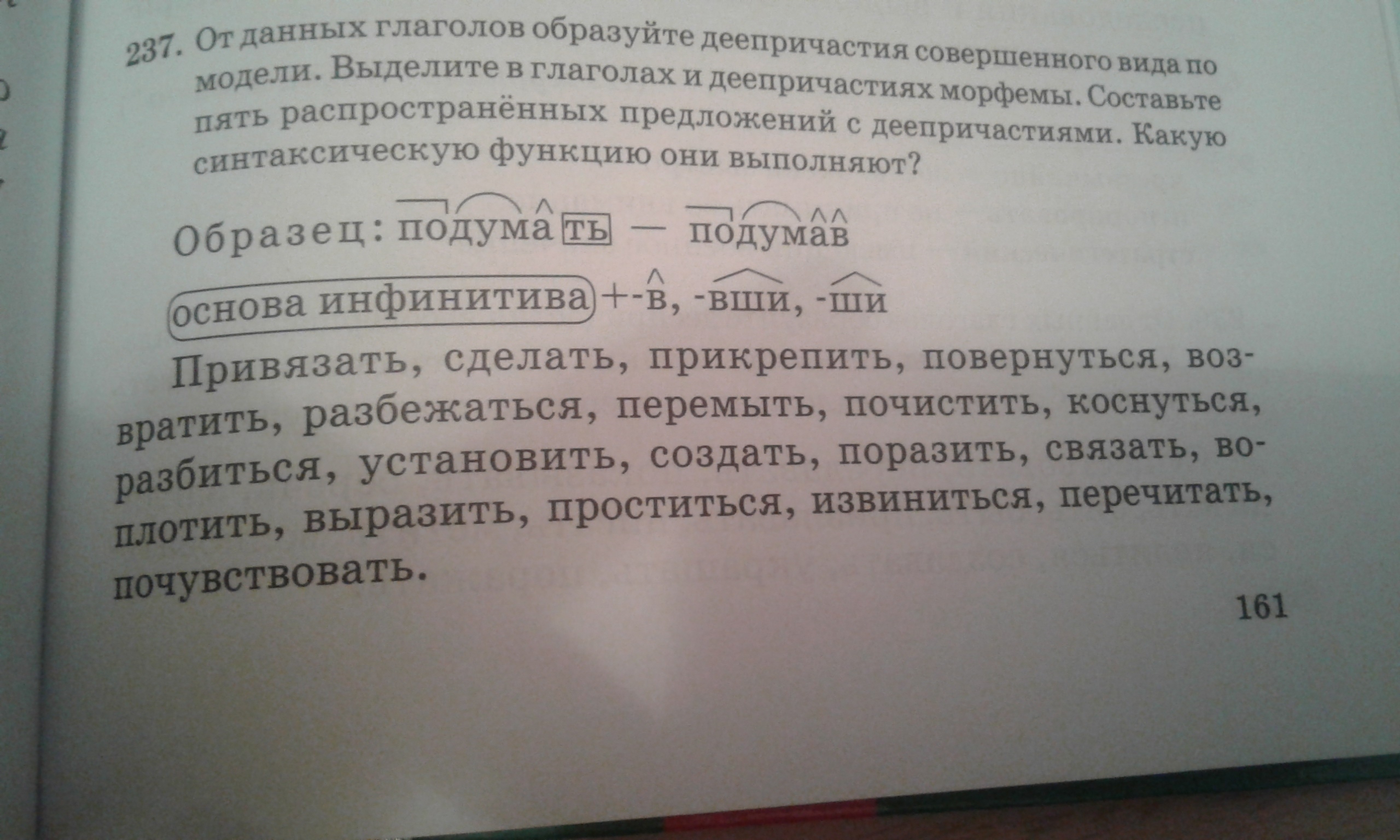 привязав, сделав, прикрепив, повернувшись, возвратив, разбежавшись, перемыв, почистив, коснувшись, разбившись, установив, создав, поразив, связав, воплотив, простившись, извинившись, перечитав, почувствовав.