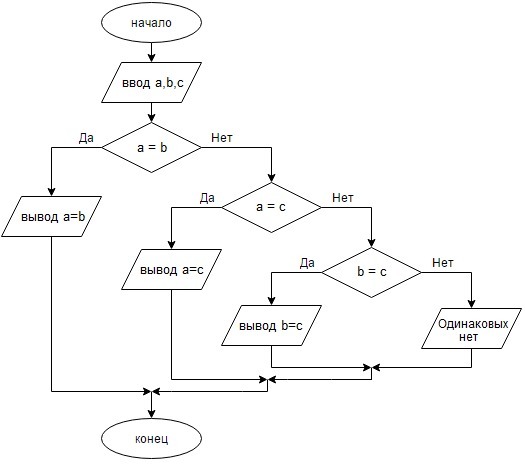 Придумайте алгоритм вводящий три целых числа и определяющий, есть ли среди введенных чисел одинаковые или нет.